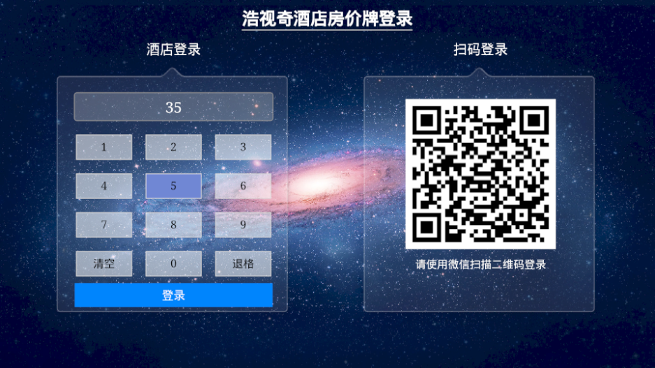 安装完房价牌APP后,启动APP会出现经下登录界面,使用电视或机顶盒摇控器输入酒店编号后点击“登录”